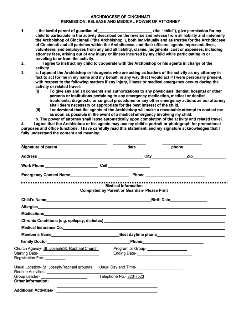 ARCHDIOCESE OF CINCINNATI PERMISSION, RELEASE AND MEDICAL POWER OF ATTORNEY 1. I, the lawful parent of guardian of (the child×, give permission for my child to participate in the activity described