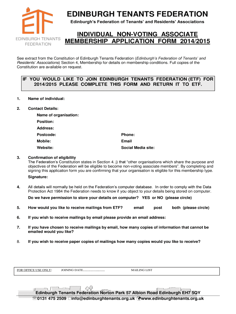 Get the free Non-voting associate membership form - Edinburgh Tenants ... - edinburghtenants org