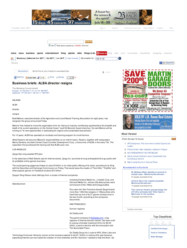 Tuesday, July 5, 2011, Sign in Site home news business sports Monterey, California Now :58F Subscriber Services Mobile Edition RSS Web Search powered by YA TOO! SEA RCH entertainment High:65F Register