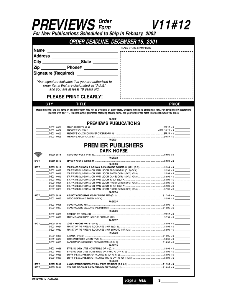 The Previews Order Form V11#12 is a key document used for ordering publications scheduled for release in February 2002. This form requires essential details such as the orderer's name and address, as well as a signature. Users should complete the form accurately to ensure successful processing of their orders.