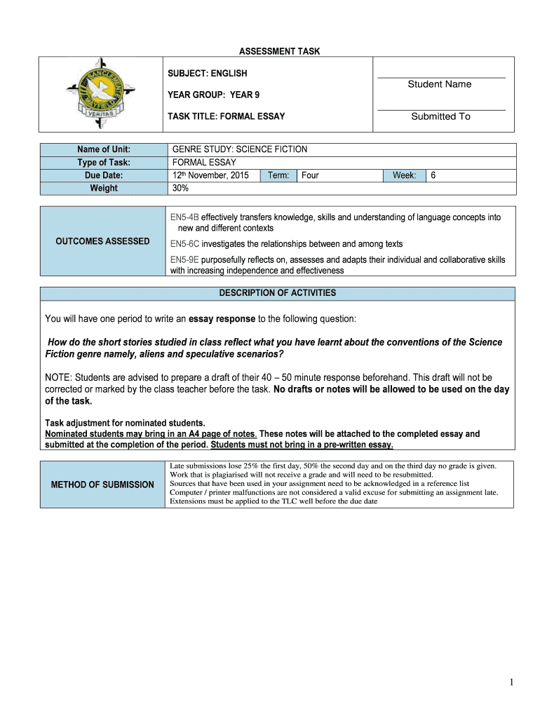 ASSESSMENT TASK SUBJECT: ENGLISH YEAR GROUP: YEAR 9 TASK TITLE: FORMAL ESSAY Name of Unit: Type of Task: Due Date: Weight GENRE STUDY: SCIENCE FICTION FORMAL ESSAY 12th November 2015 Term: Four 30%