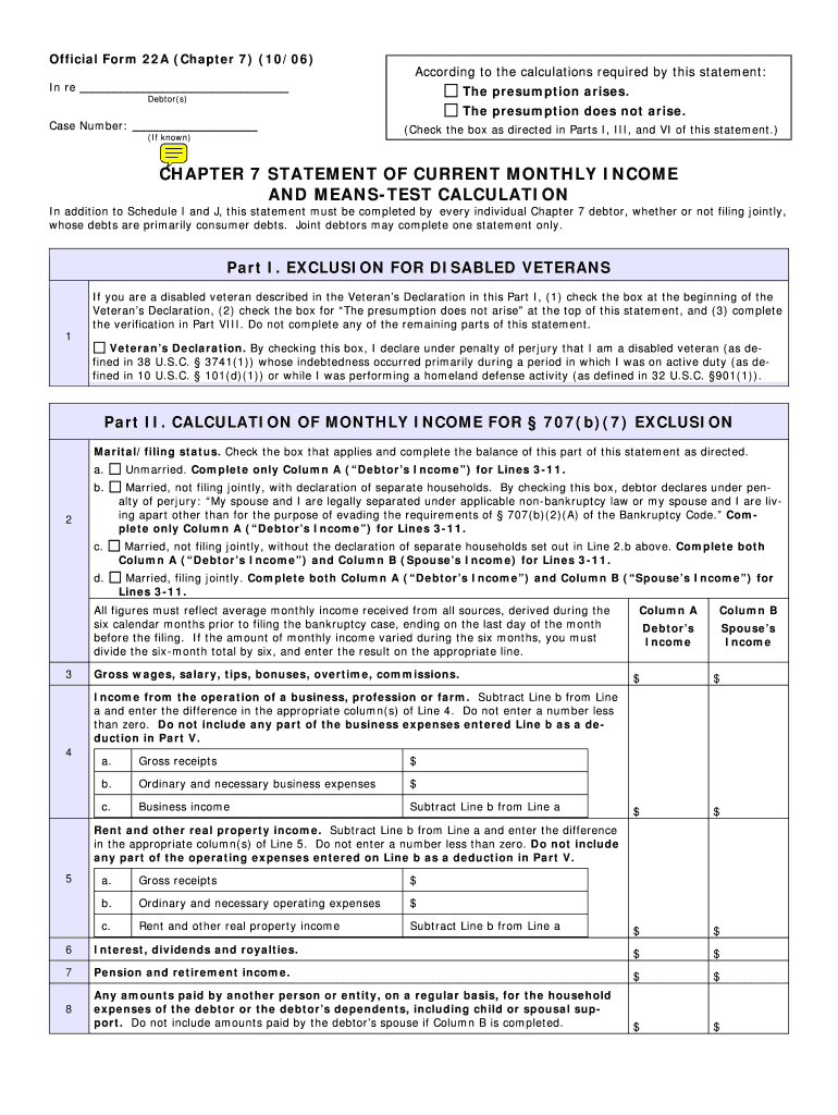 Individuals who are considering filing for Chapter 7 bankruptcy are required to file form b22a 1006.