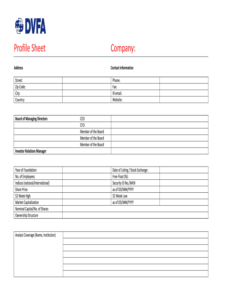 ProfileSheet Company: Address Contact information Street: Opcode: City: Country: Phone: Fax: IR email: Website: BoardofManagingDirectors InvestorRelationsManager YearofFoundation: No.employees: Indices×national×international)