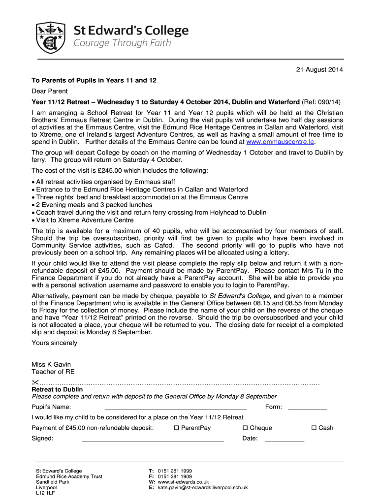 21 August 2014 To Parents of Pupils in Years 11 and 12 Dear Parent Year 11×12 Retreat Wednesday 1 to Saturday 4 October 2014, Dublin and Waterford (Ref: 090×14) I am arranging a School Retreat for