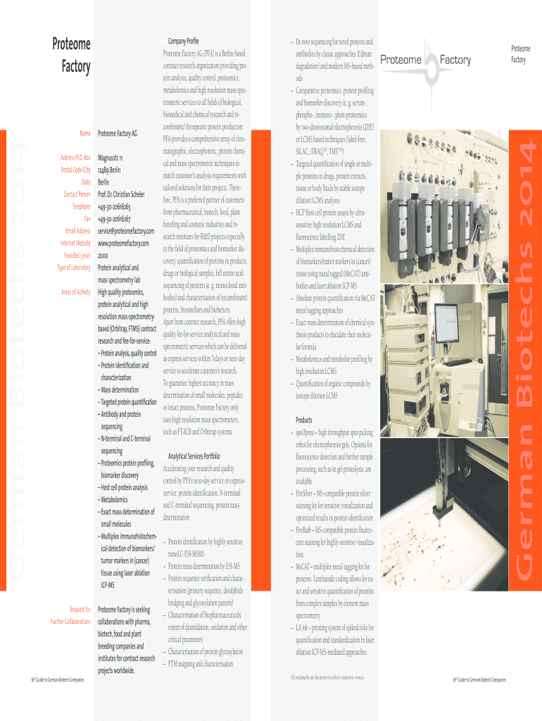 Company Prole Name Protégé Factory AG Magnums. 11 12489 Berlin Prof. Dr. Christian Schemer +493020616265 +493020616267 service proteomefactory.com www.proteomefactory.com 2000 Protein analytical