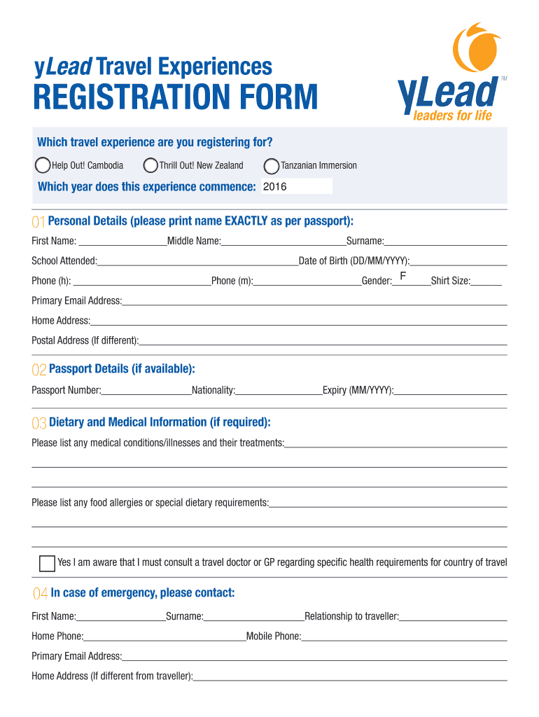 Lead Travel Experiences REGISTRATION FORM leaders for life Which travel experience are you registering for? Help Out! Cambodia Thrill Out! New Zealand Tanzanian Immersion Which year does this experience