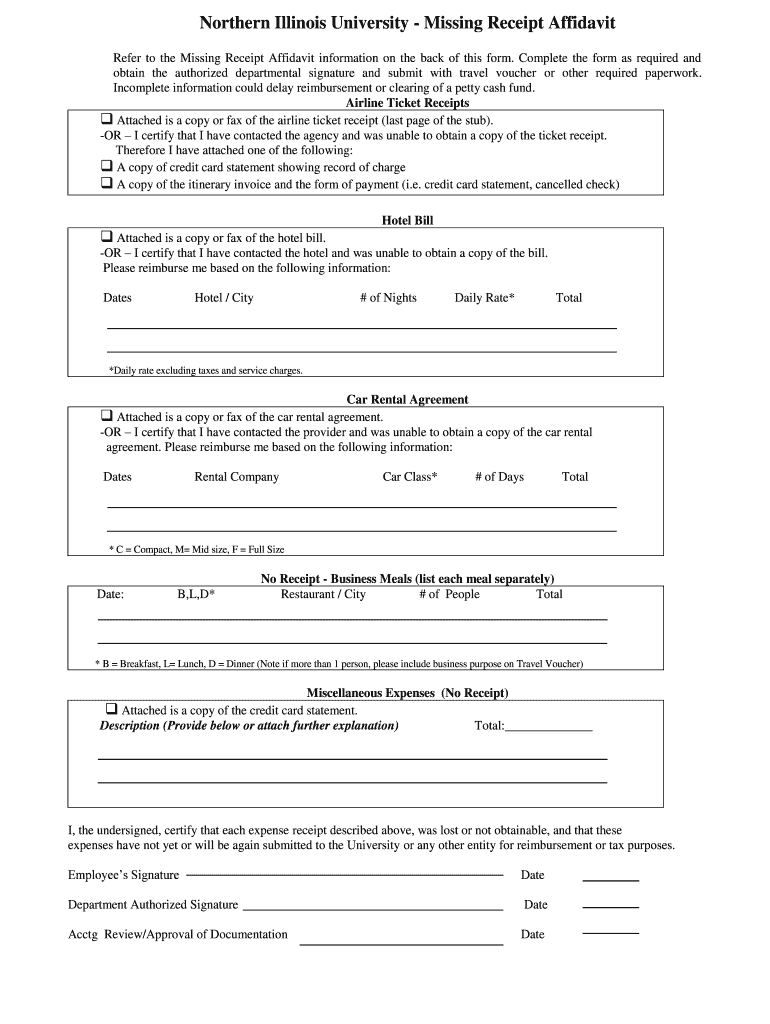 Northern Illinois University Missing Receipt Affidavit Refer to the Missing Receipt Affidavit information on the back of this form. Complete the form as required and obtain the authorized departmental