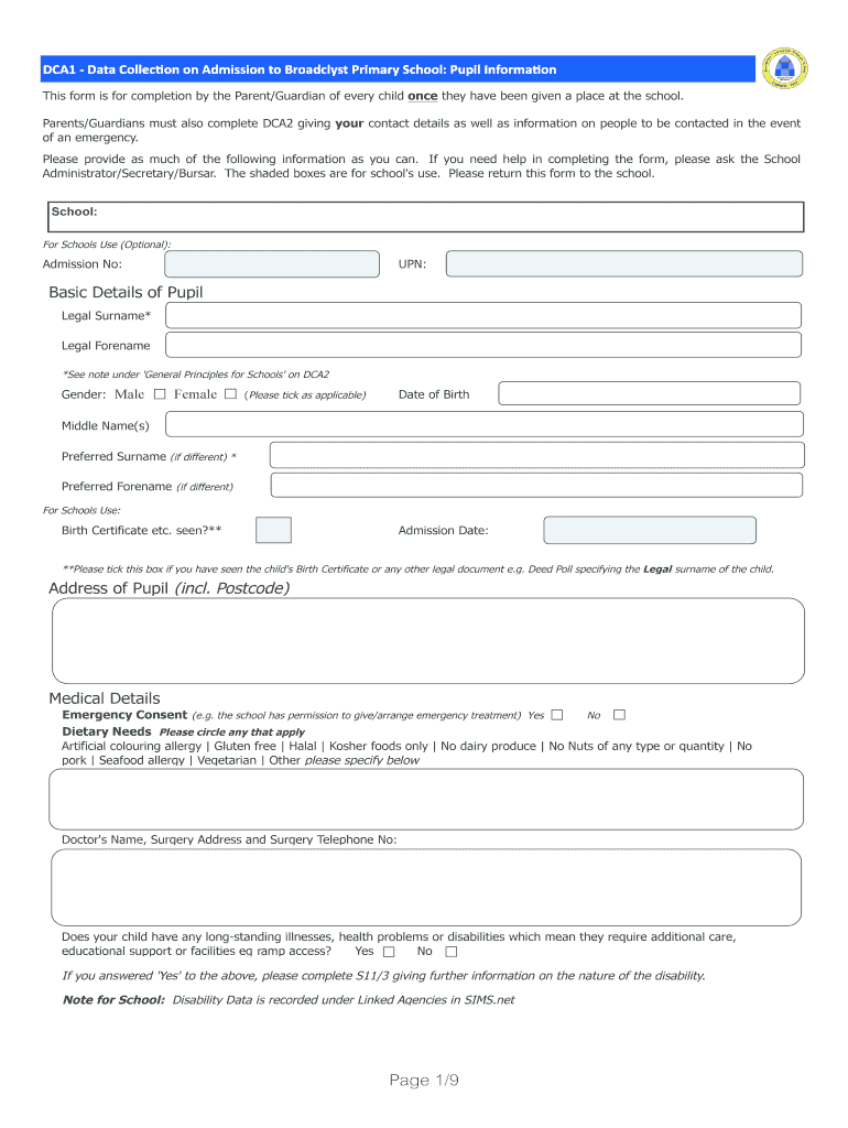 This form is for completion by the Parent×Guardian of every child once they have been given a place at the school.