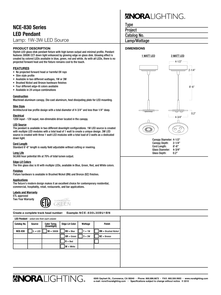 Lamp: 1W3W LED Source Type Project Catalog No. Lamp×Wattage PRODUCT DESCRIPTION Dimensions NCE830 Series LED Pendant Stylish LED glass disk pendant fixture with high lumen output and minimal profile.