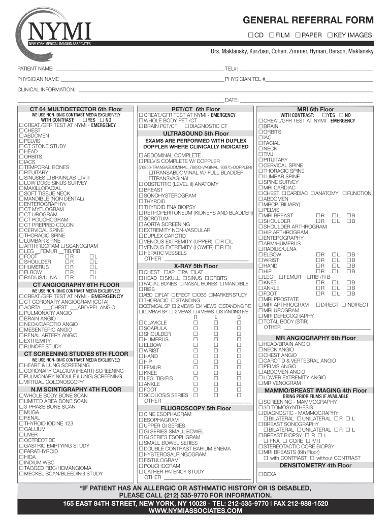 GENERAL REFERRAL FORM CD FILM PAPER KEY IMAGES NEW YORK MEDICAL IMAGING Associated. Maklansky, Urban, Cohen, Zimmer, Hyman, Person, Maklansky PATIENT NAME: TEL#: PHYSICIAN NAME PHYSICIAN TEL # CLINICAL