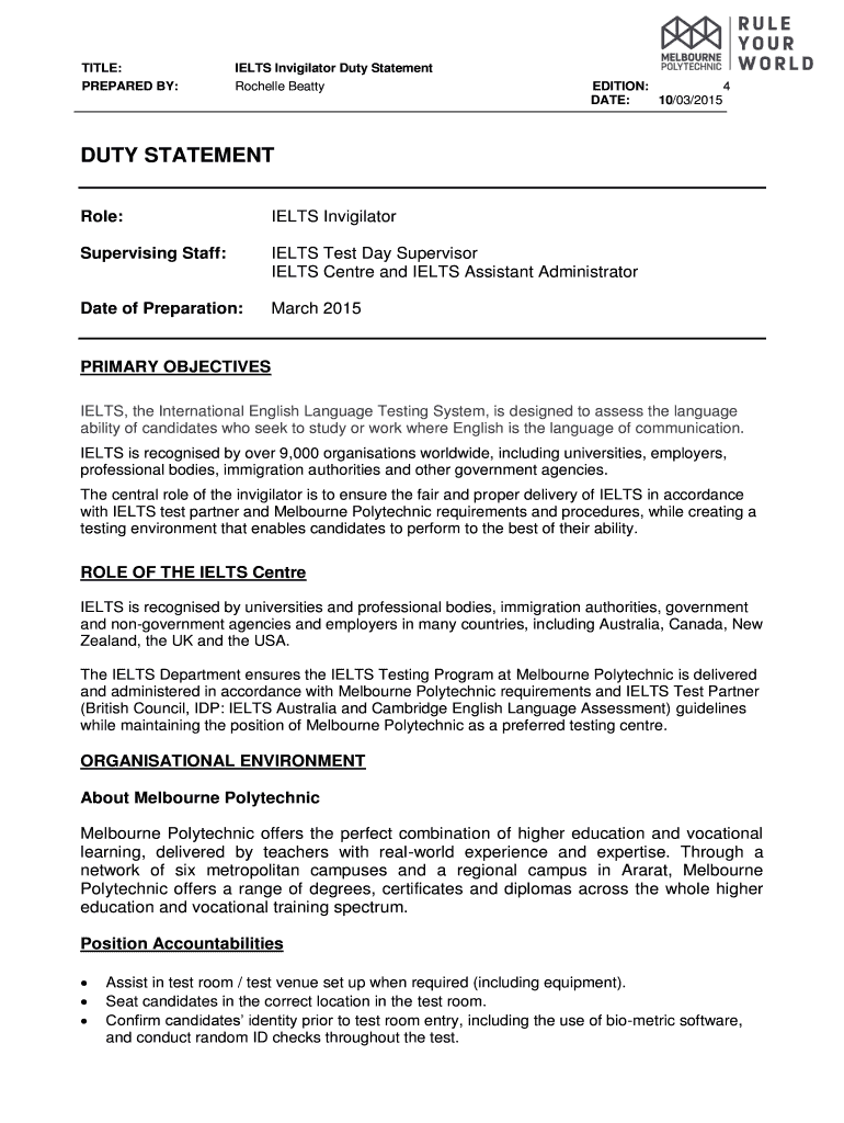 TITLE: PREPARED BY: IELTS Invigilator Duty Statement Rochelle Beatty EDITION: 4 DATE: 10×03/2015 DUTY STATEMENT Role: IELTS Invigilator Supervising Staff: IELTS Test Day Supervisor IELTS Center and