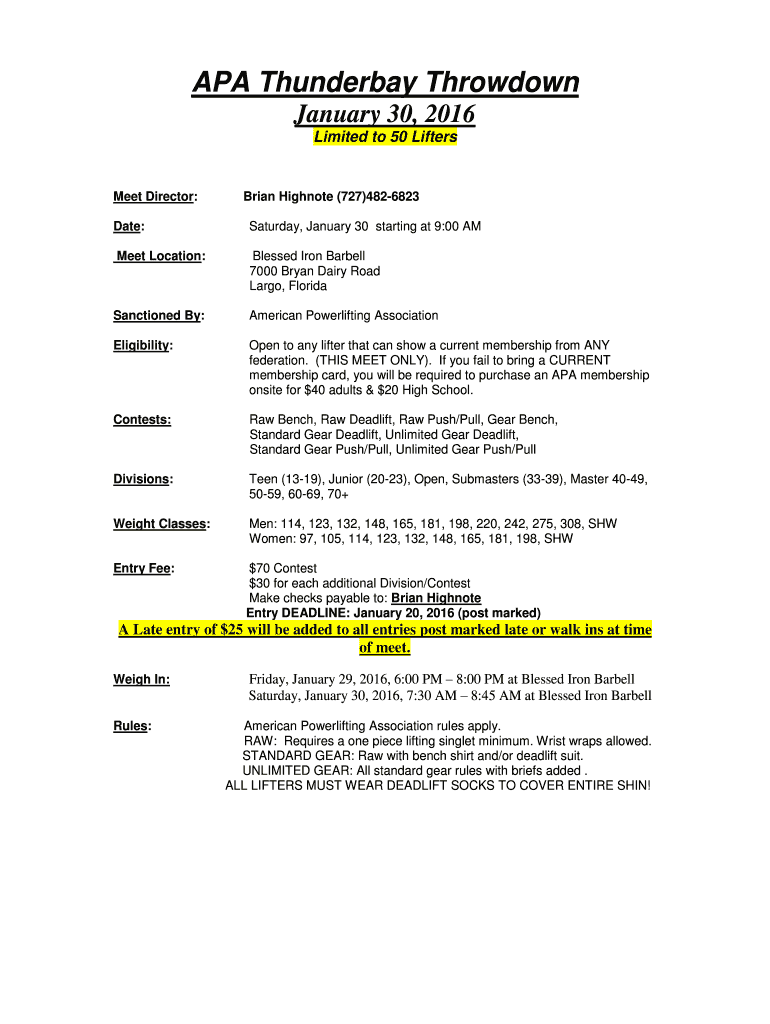 APA Thunder Bay Throw down January 30, 2016, Limited to 50 Lifters Meet Director: Brian High note (727×4826823 Date: Saturday, January 30 starting at 9:00 AM Meet Location: Blessed Iron Barbell 7000