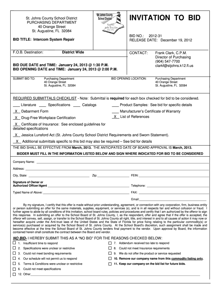 This document serves as an invitation for qualified suppliers to submit bids for the repair of intercom systems within the St. Johns County School District. It outlines the bid requirements, submission