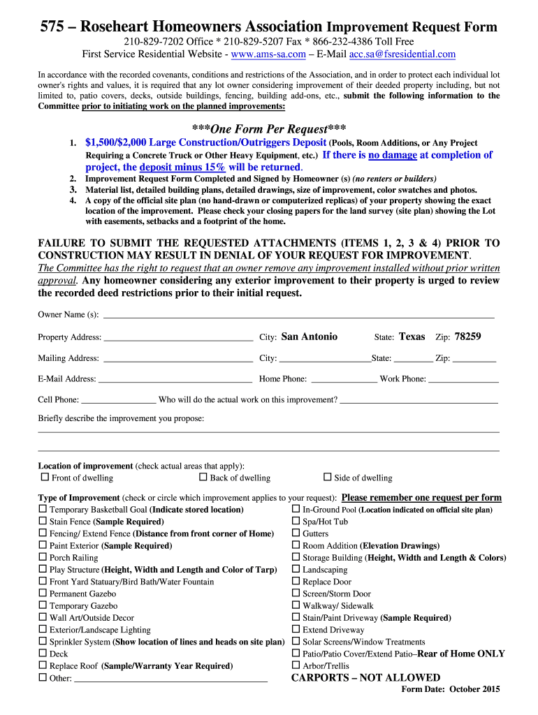 575 Rose heart Homeowners Association Improvement Request Form 210-829-7202 Office * 210-829-5207 Fax * 866-232-4386 Toll Free First Service Residential Website — www.ams-sa.com E-Mail acc.SA fsresidential.com