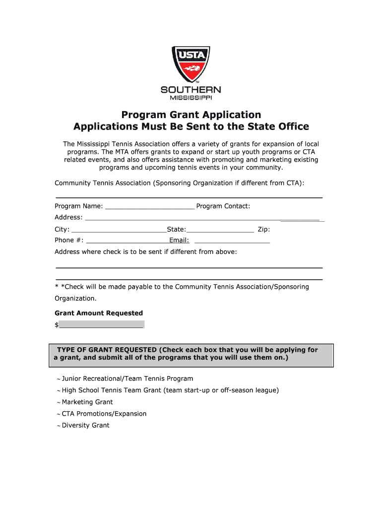 Program Grant Application Applications Must Be Sent to the State Office The Mississippi Tennis Association offers a variety of grants for expansion of local programs. The MTA offers grants to expand