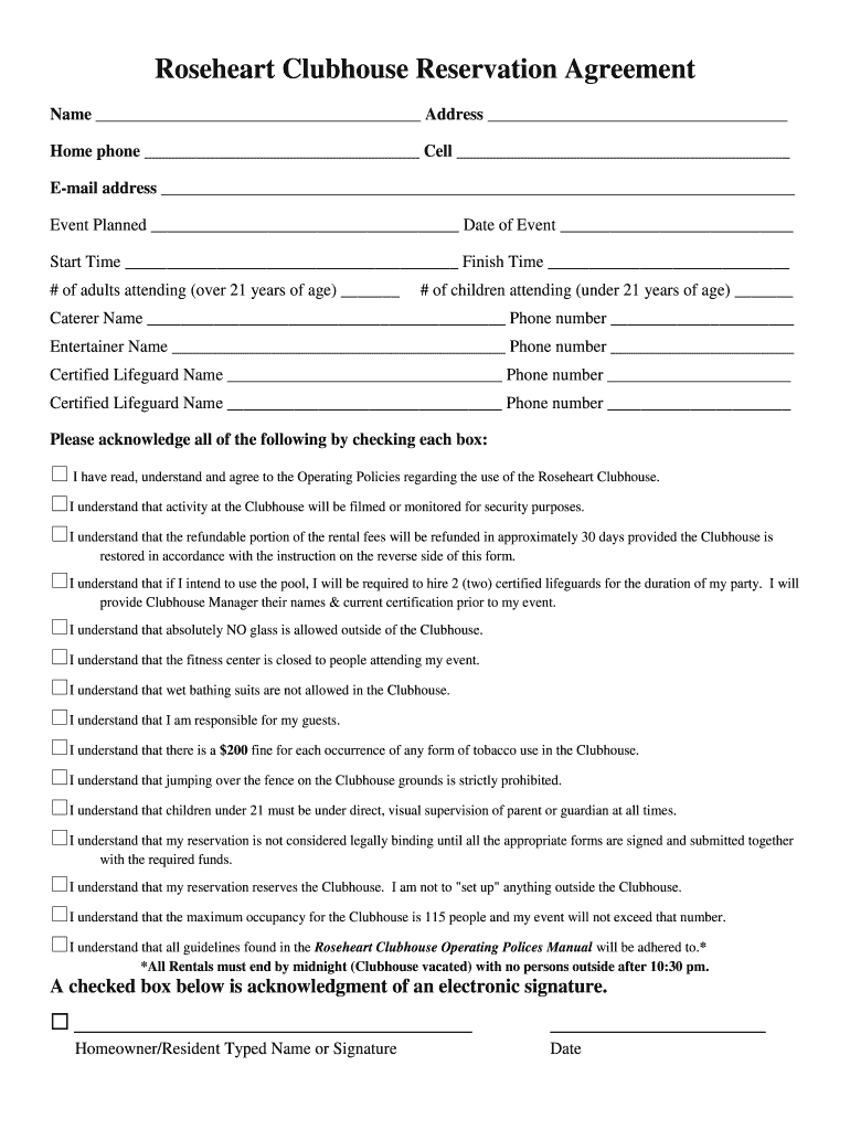 Get the free Roseheart Clubhouse Reservation Agreement Name Address Home phone Cell Email address...