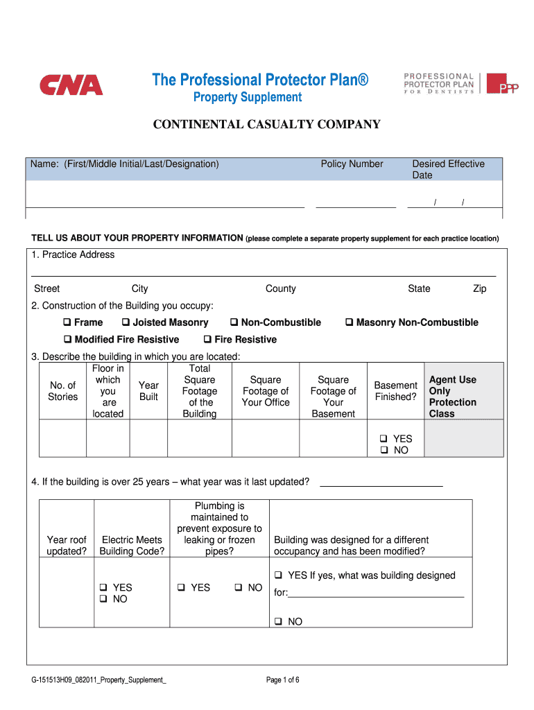 The Professional Protector Plan Property Supplement CONTINENTAL CASUALTY COMPANY Name: (First×Middle Initial×Last×Designation) Policy Number Desired Effective Date / / TELL US ABOUT YOUR PROPERTY