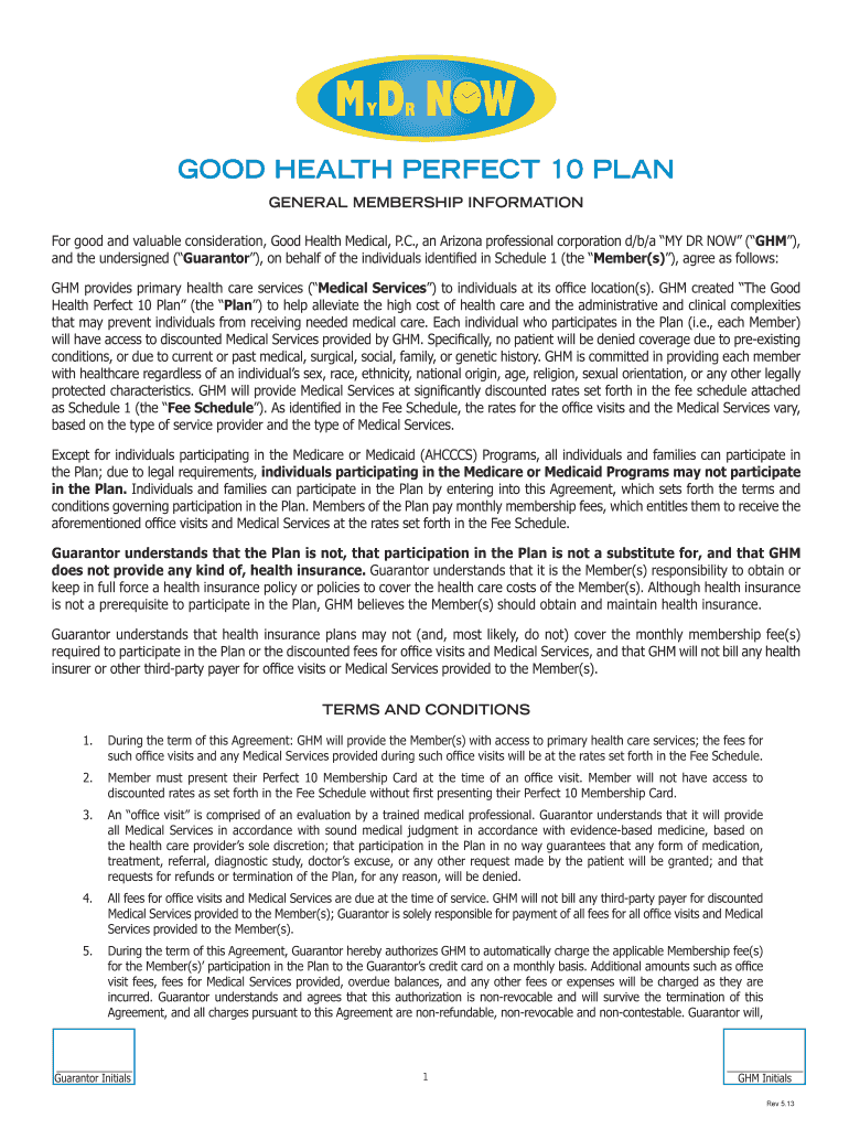 GOOD HEALTH PERFECT 10 PLAN GENERAL MEMBERSHIP INFORMATION For good and valuable consideration, Good Health Medical, P.C., an Arizona professional corporation d×b/a DR NOW (GHM), and the undersigned