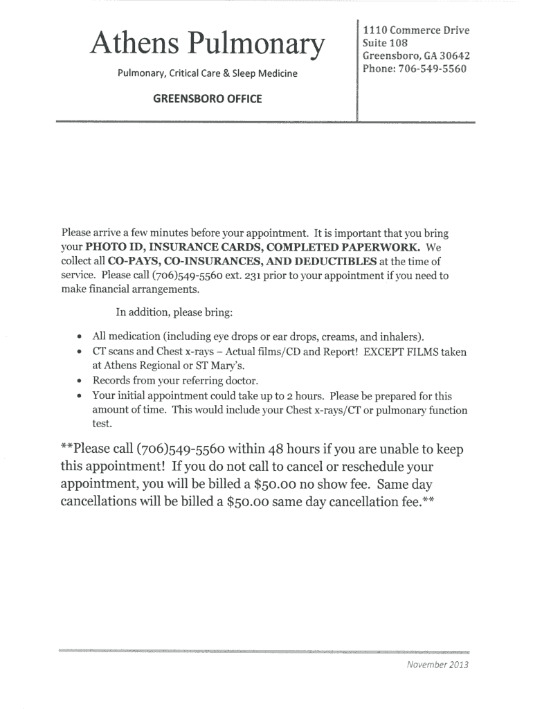 Athens Pulmonary, Critical Care & Sleep Medicine 1110 Commerce Drive Suite 108 Greensboro, GA 30642 Phone: 7065495560 GREENSBORO OFFICE Please arrive a few minutes before your appointment. It is important