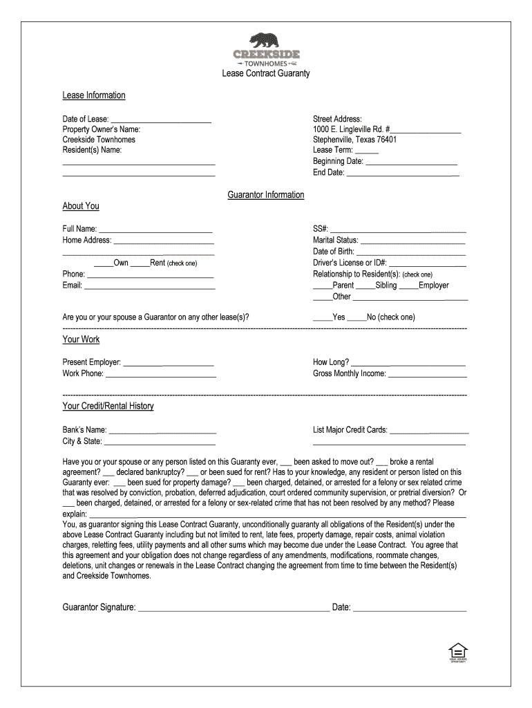 Lease Contract Guaranty Lease Information Date of Lease: Property Owners Name: Creekside Town homes Resident’s) Name: Street Address: 1000 E. Libreville Rd. # Steubenville, Texas 76401 Lease Term: