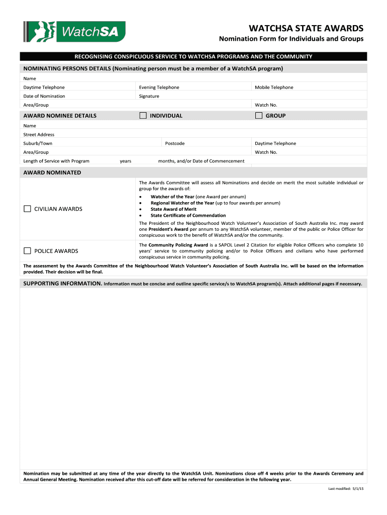 WATCH SA STATE AWARDS Nomination Form for Individuals and Groups Recognizing CONSPICUOUS SERVICE TO WATCH SA PROGRAMS AND THE COMMUNITY NOMINATING PERSONS DETAILS (Nominating person must be a member
