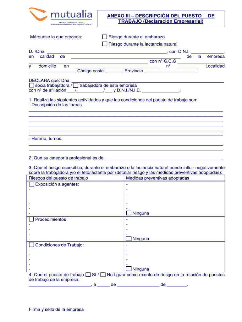 Get the free ANEXO III DESCRIPCIN DEL PUESTO DE TRABAJO Declaracin - mutualia