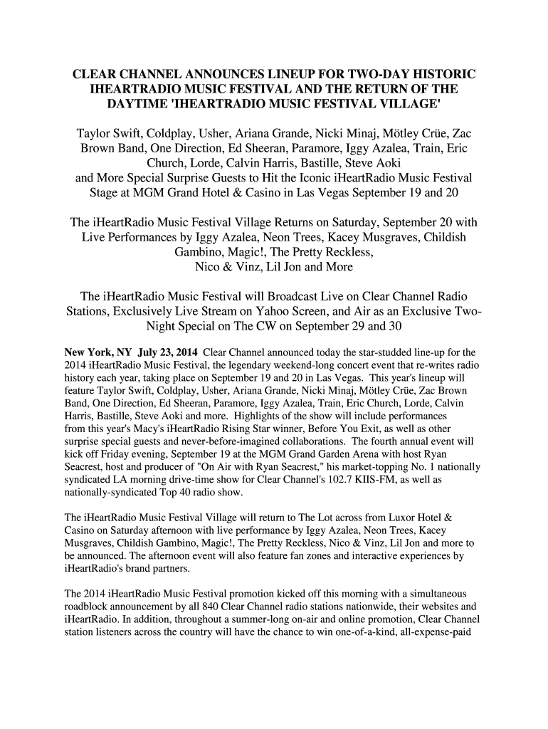 CLEAR CHANNEL ANNOUNCES LINEUP FOR TODAY HISTORIC iHeartRadio MUSIC FESTIVAL AND THE RETURN OF THE DAYTIME 'iHeartRadio MUSIC FESTIVAL VILLAGE Taylor Swift, Coldplay, Usher, Ariana Grande, Nicki Minaj,