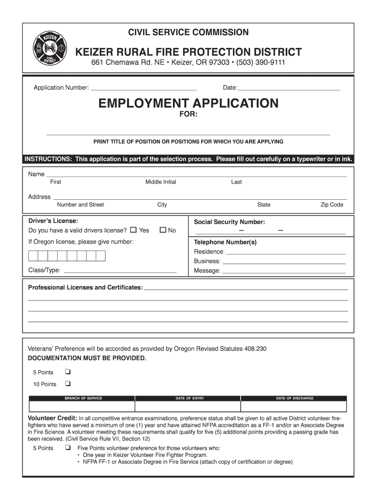 CIVIL SERVICE COMMISSION KEIZER RURAL FIRE PROTECTION DISTRICT 661 Schemata Rd. NE Keizer, OR 97303 ×503× 3909111 Application Number: Date: EMPLOYMENT APPLICATION FOR: PRINT TITLE OF POSITION OR