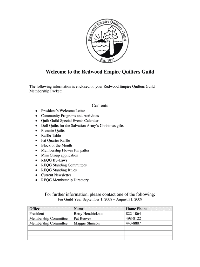 Welcome to the Redwood Empire Quilters Guild The following information is enclosed on your Redwood Empire Quilters Guild Membership Packet: Contents Presidents Welcome Letter Community Programs and