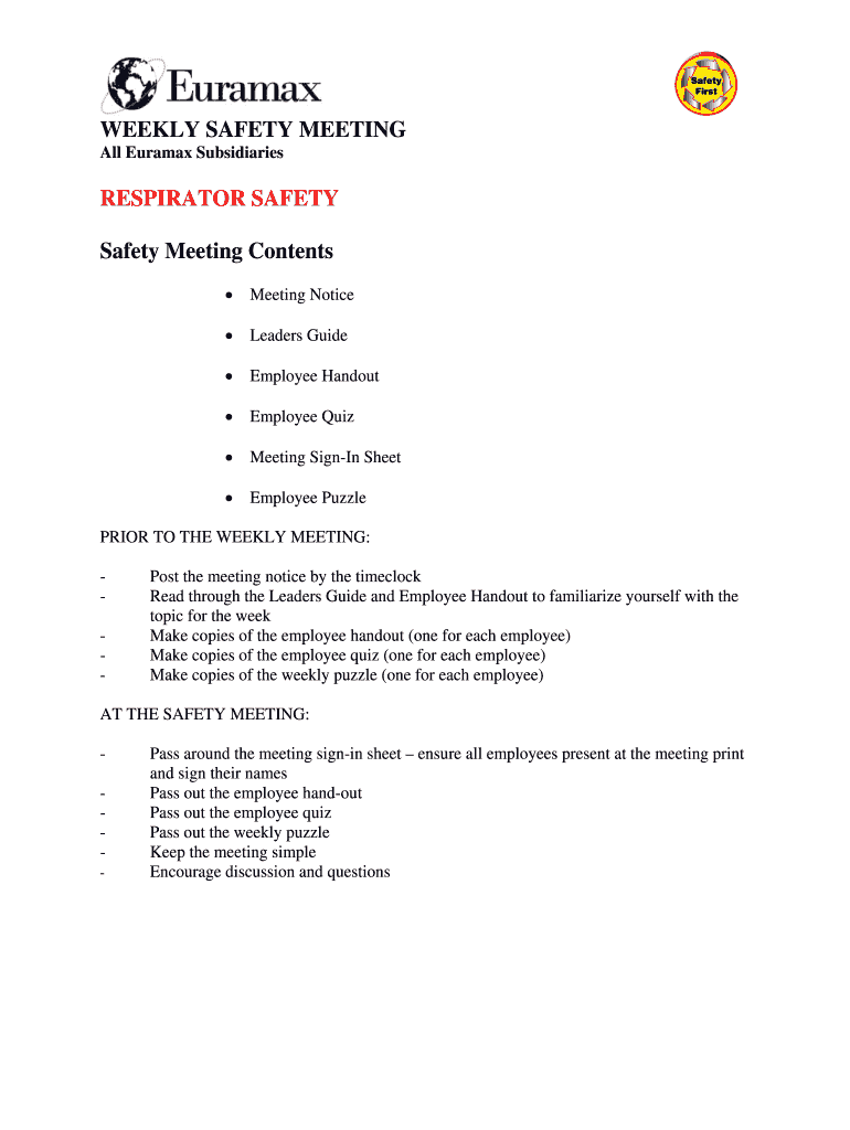 WEEKLY SAFETY MEETING All Duramax Subsidiaries RESPIRATOR SAFETY Meeting Contents Meeting Notice Leaders Guide Employee Handout Employee Quiz Meeting Signing Sheet Employee Puzzle PRIOR TO THE WEEKLY