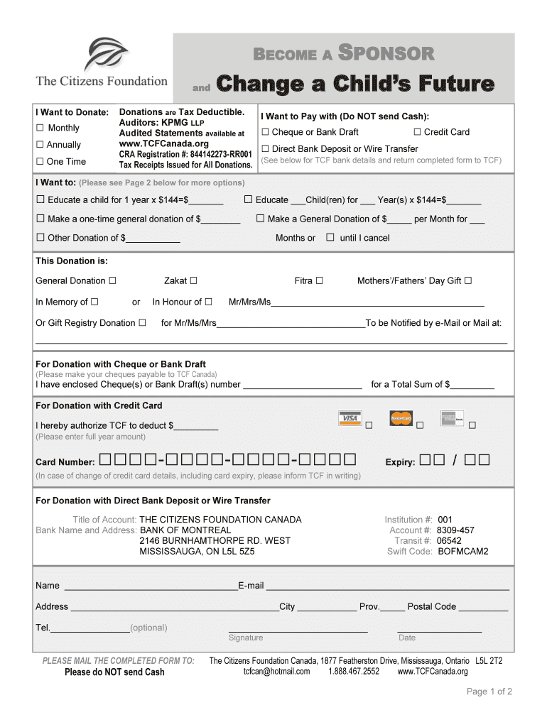 SPONSOR and Change a Child's Future BECOME A Want to Donate: Monthly Annually One Time Donations are Tax Deductible. I Want to Pay with (Do NOT send Cash): Auditors: KPMG LLP Check or Bank Draft Credit