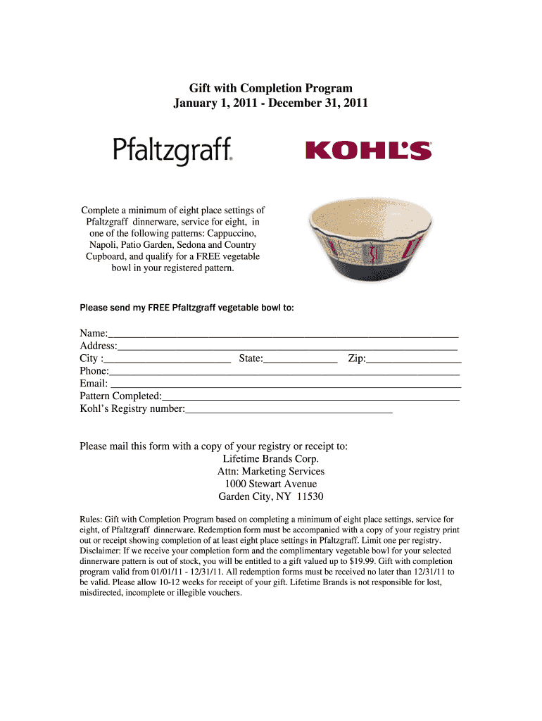 Gift with Completion Program January 1, 2011, December 312011,11 Complete a minimum of eight place settings of Pfaltzgraff dinnerware, service for eight, in one of the following patterns: Cappuccino,