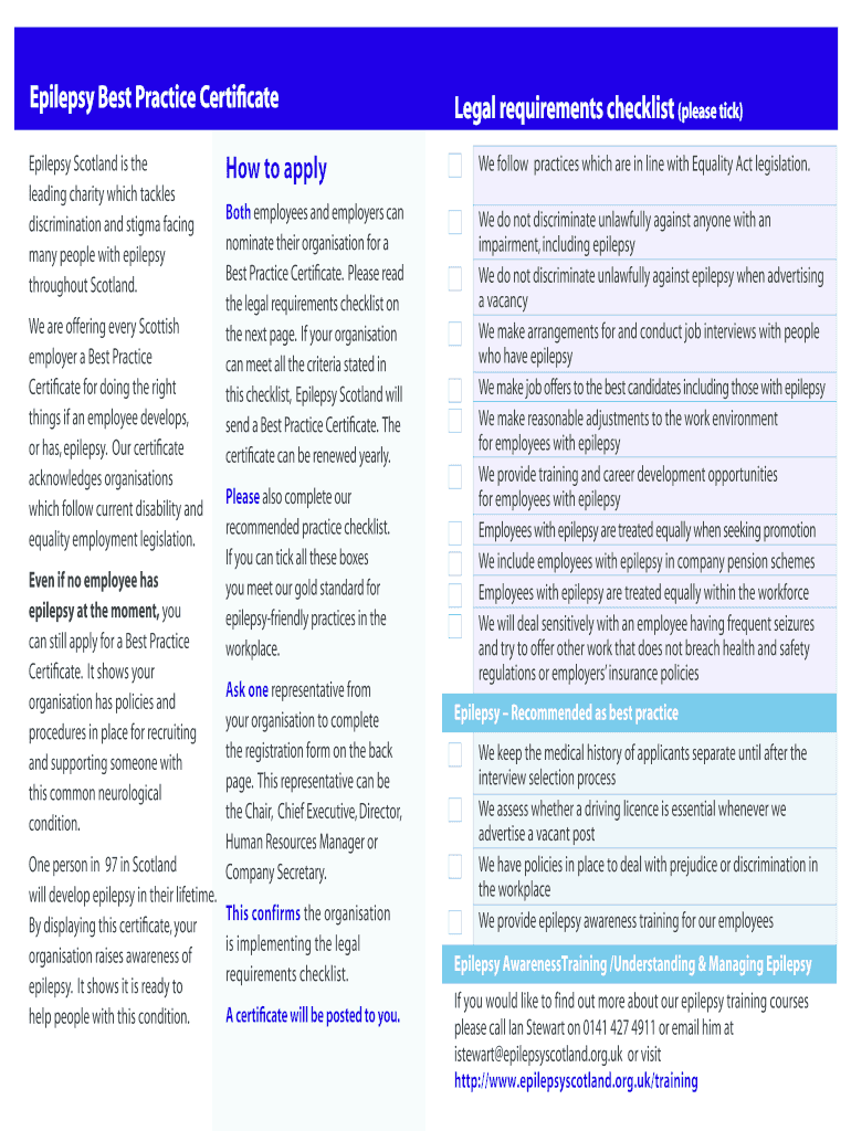 The epilepsy best practice certificate is a document that verifies an individual or organization's compliance with the best practices in epilepsy management and care.