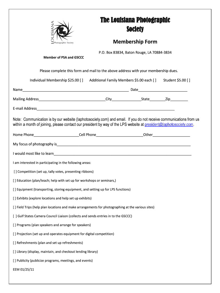 The Louisiana Photographic Society Membership Form P.O. Box 83834, Baton Rouge, LA 708843834 Member of PSA and GS CCC Please complete this form and mail to the above address with your membership dues.