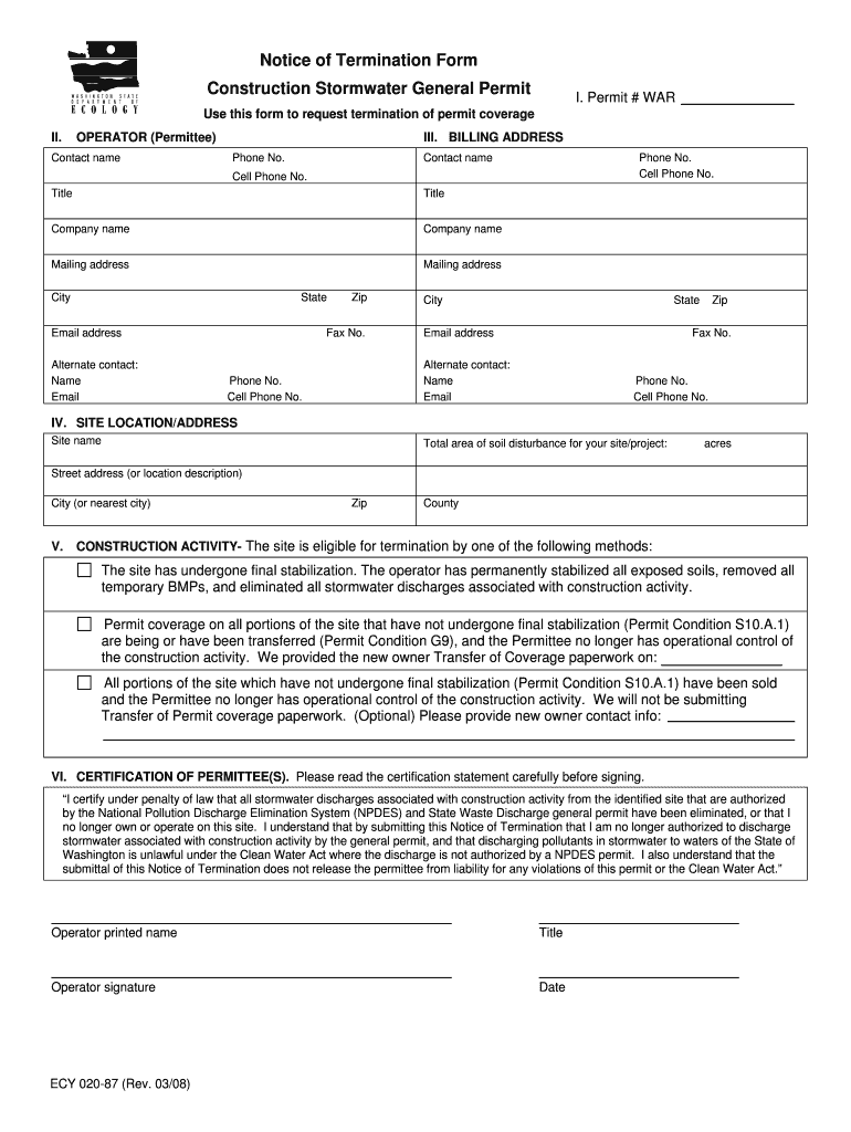This form is used to request termination of permit coverage for stormwater discharges associated with construction activities. It contains sections for operator information, site location, and certification