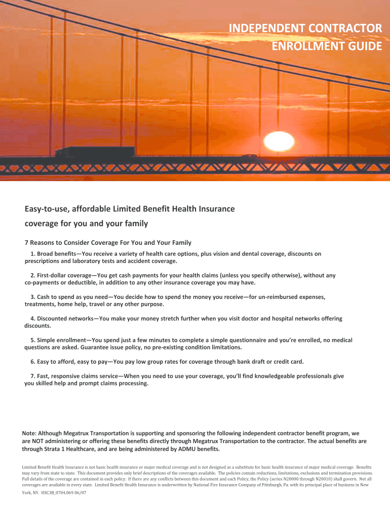 INDEPENDENT CONTRACTOR ENROLLMENT GUIDE Espouse, affordable Limited Benefit Health Insurance coverage for you and your family 7 Reasons to Consider Coverage For You and Your Family 1. Broad benefits