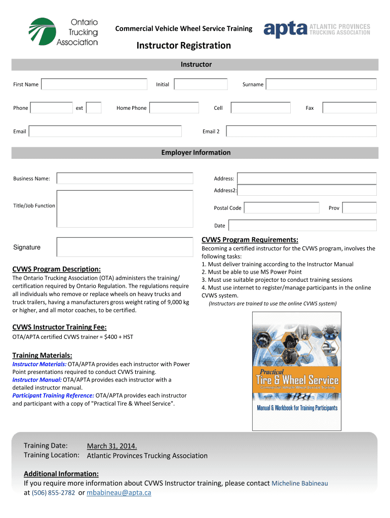 Commercial Vehicle Wheel Service Training Instructor Registration Instructor First Name Phone Initial ext Surname Home Phone Cell Email Fax Email 2 Employer Information Business Name: Address: Address2: