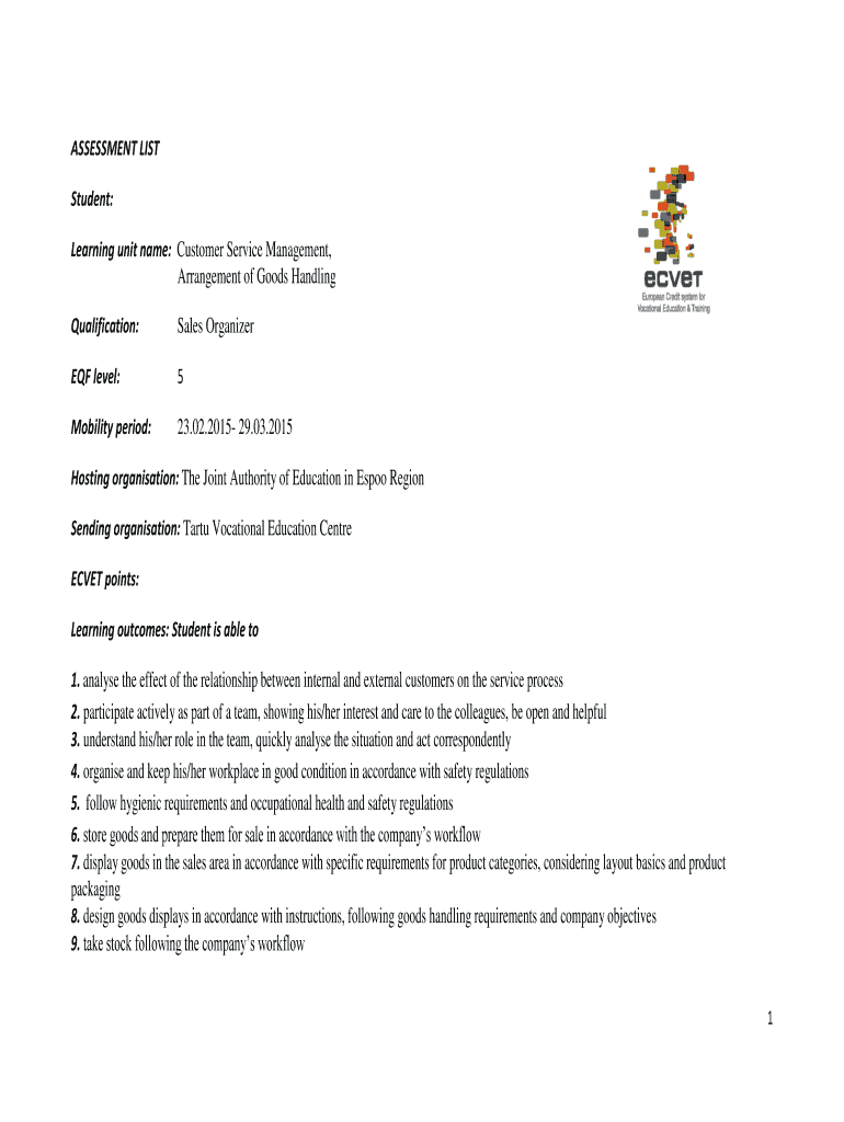 ASSESSMENT LIST Student: Learning unit name: Customer Service Management, Arrangement of Goods Handling Qualification: Sales Organizer EQF level: 5 Mobility period: 23.02.2015 29.03.2015 Hosting organization: