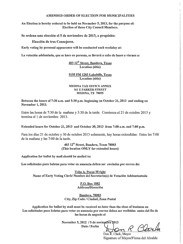 AMENDED ORDER OF ELECTION FOR MUNICIPALITIES An Election is hereby ordered to be held on November 5, 2013, for the purpose of: Election of three CFJ Council Members. Se order RNA election El 5 de