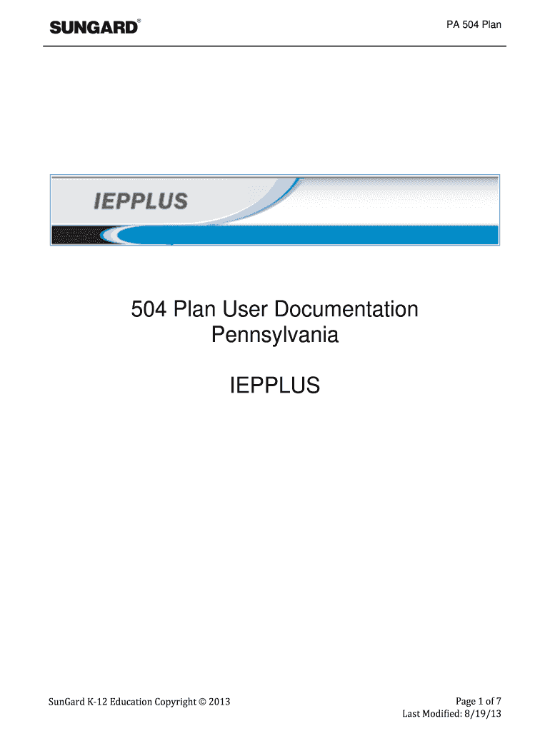 PA 504 Plan 504 Plan User Documentation Pennsylvania PLUS Sugar K12 Education Copyright 2013-Page 1 of 7 Last Modified: 8×19/13 PA 504 Plan TABLE OF CONTENTS OVERVIEW ...........................................................................................................................................................................