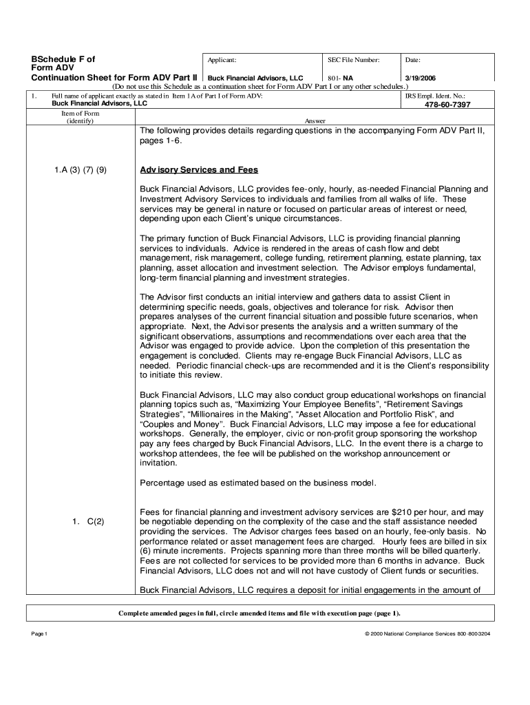 Schedule F of Form ADV Continuation Sheet for Form ADV Part II Applicant: SEC File Number: Date: Buck Financial Advisors, LLC 801 NA 3×19/2006 (Do not use this Schedule as a continuation sheet for