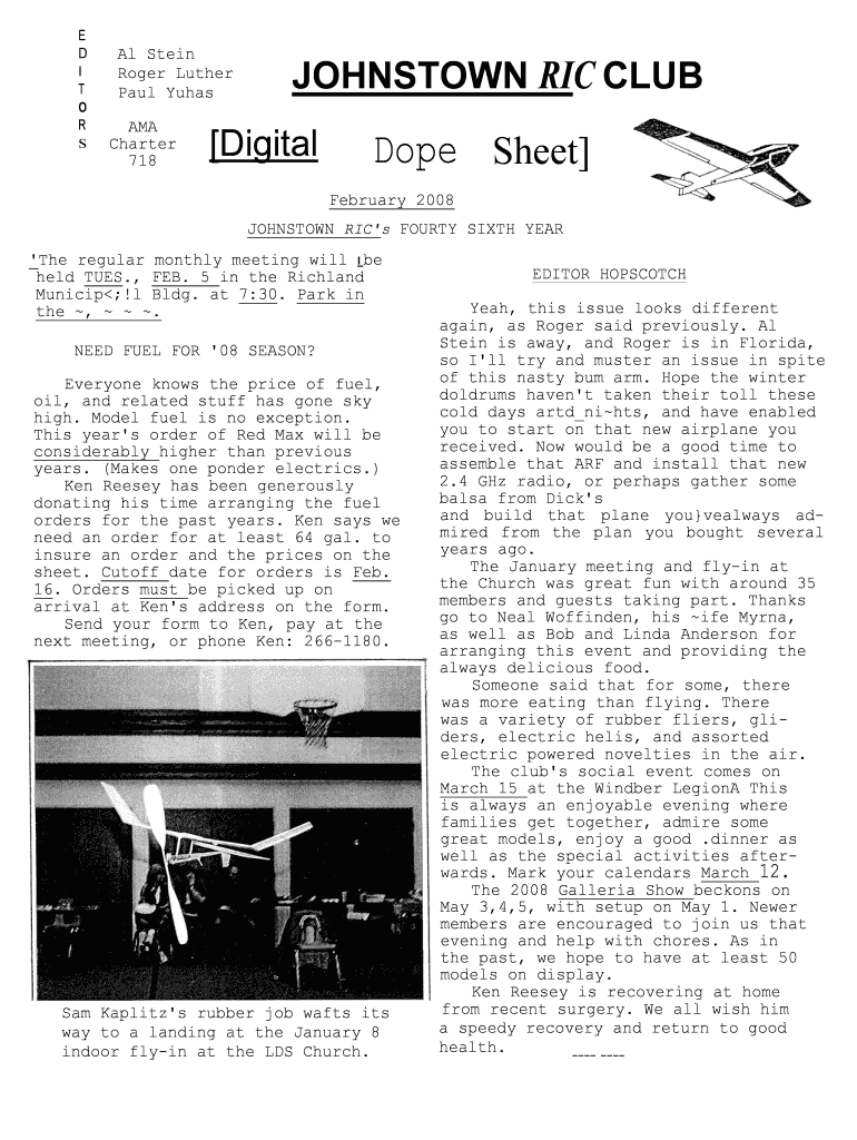E D I T o R S Al Stein Roger Luther Paul Yumas AMA Charter 718 JOHNSTOWN RIC CLUB Digital Dope Sheet February 2008 JOHNSTOWN RIC's FOURTH SIXTH YEAR 'The regular monthly meeting will I be held TUES.,