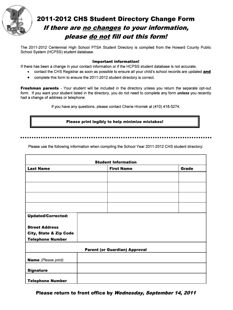 2011-2012 CHS Student Directory Change Form If there are no changes to your information, please do not fill out this form! The 2011-2012 Centennial High School PSA Student Directory is compiled from