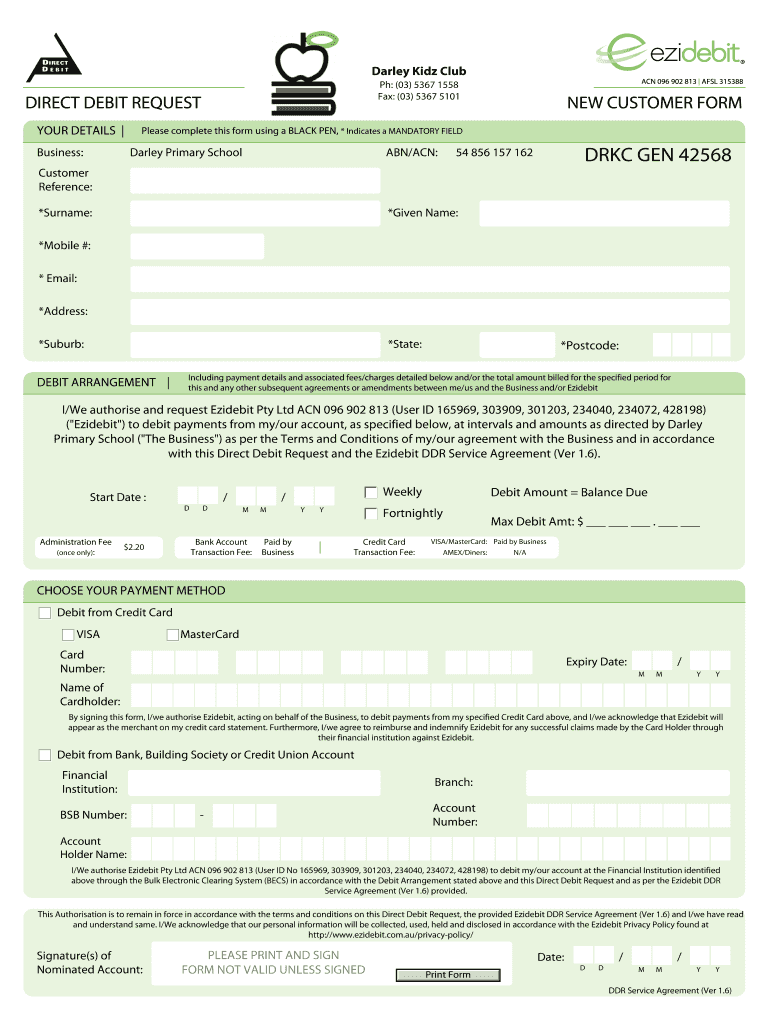 Darla Kids Club DIRECT DEBIT REQUEST YOUR DETAILS Business: ACN 096 902 813 ADSL 315388 pH: (03× 5367 1558 Fax: (03× 5367 5101 NEW CUSTOMER FORM Please complete this form using a BLACK PEN, * Indicates
