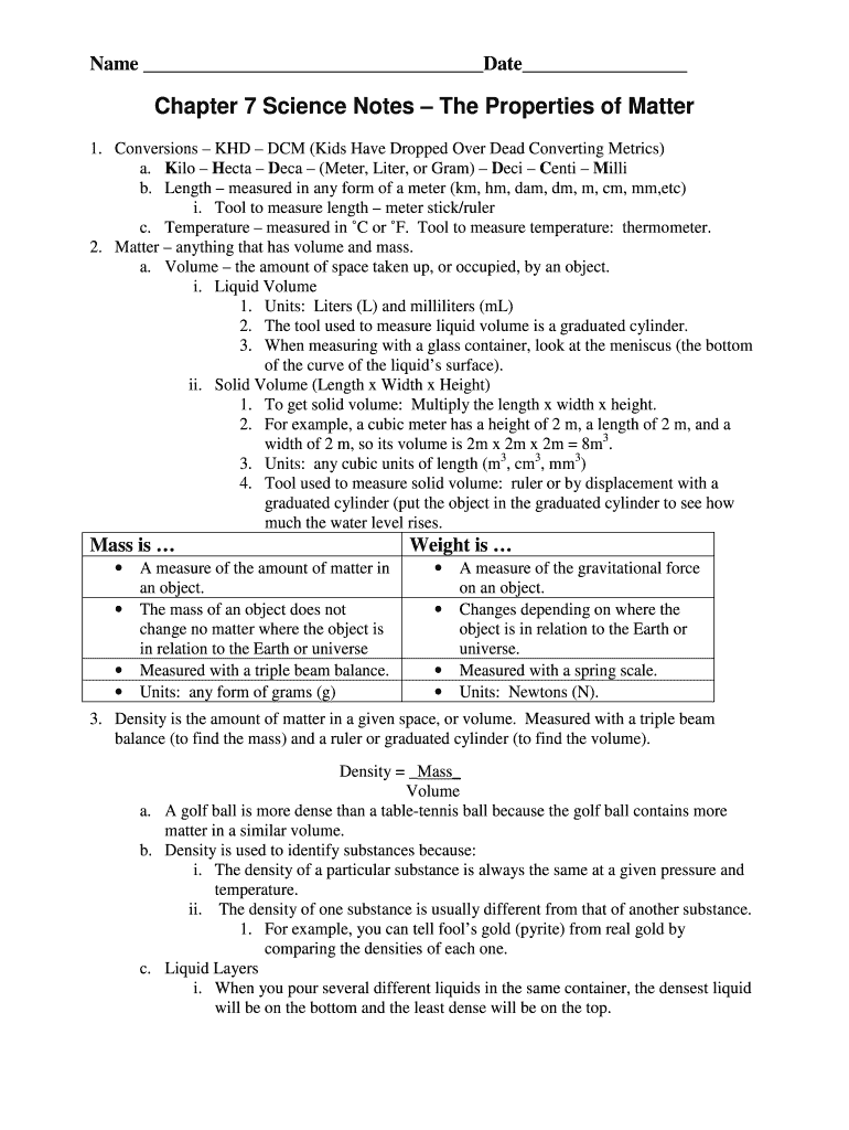 Name Date Chapter 7 Science Notes The Properties of Matter 1. Conversions HD DCM (Kids Have Dropped Over Dead Converting Metrics) a. Kilo Tecta DECA (Meter, Liter, or Gram) Deck Cent Mill b. Length