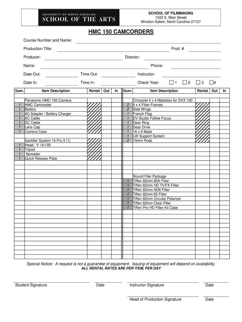 SCHOOL OF FILMMAKING 1533 S. Main Street Winston-Salem, North Carolina 27127 HMC 150 CAMCORDERS Course Number and Name: Production Title: Prod. # Producer: Director: Name: Phone: Date Out: Time Out: