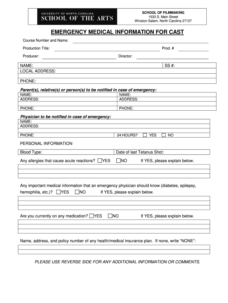 Get the free EMERGENCY MEDICAL INFORMATION FOR CAST - mis15 uncsa