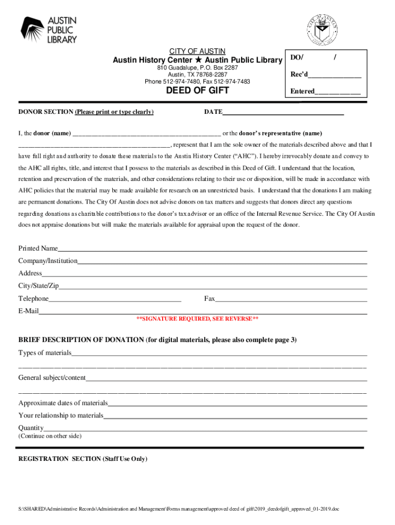 CITY OF AUSTINAustin History Center Austin Public Library 810 Guadalupe, P.O. Box 2287 Austin, TX 787682287 Phone 5129747480, Fax 5129747483DEED OF GIFT DONOR SECTION (Please print or type clearly)DO//Recd