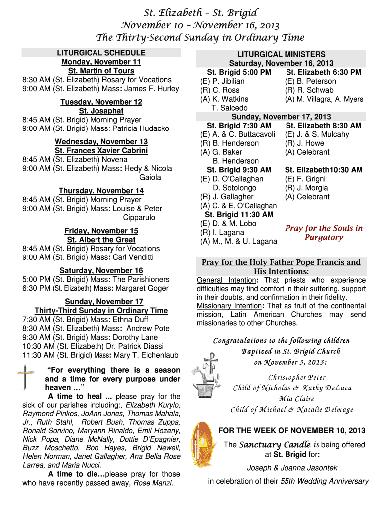 Brigid St. Elizabeth St. Brigid November 10 November 16, 2013 16, 2013 Thirty The ThirtySecond Sunday in Ordinary Time LITURGICAL SCHEDULE Monday, November 11 St. Martin of Tours 8:30 AM (St. Elizabeth)