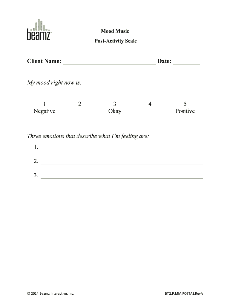 Mood Music Photoactivity Scale Client Name: Date: My mood right now is: 1 Negative 2 3 Okay 4 5 Positive Three emotions that describe what I'm feeling are: 1. 2. 3. 2014 Beam Interactive, Inc. BTG.